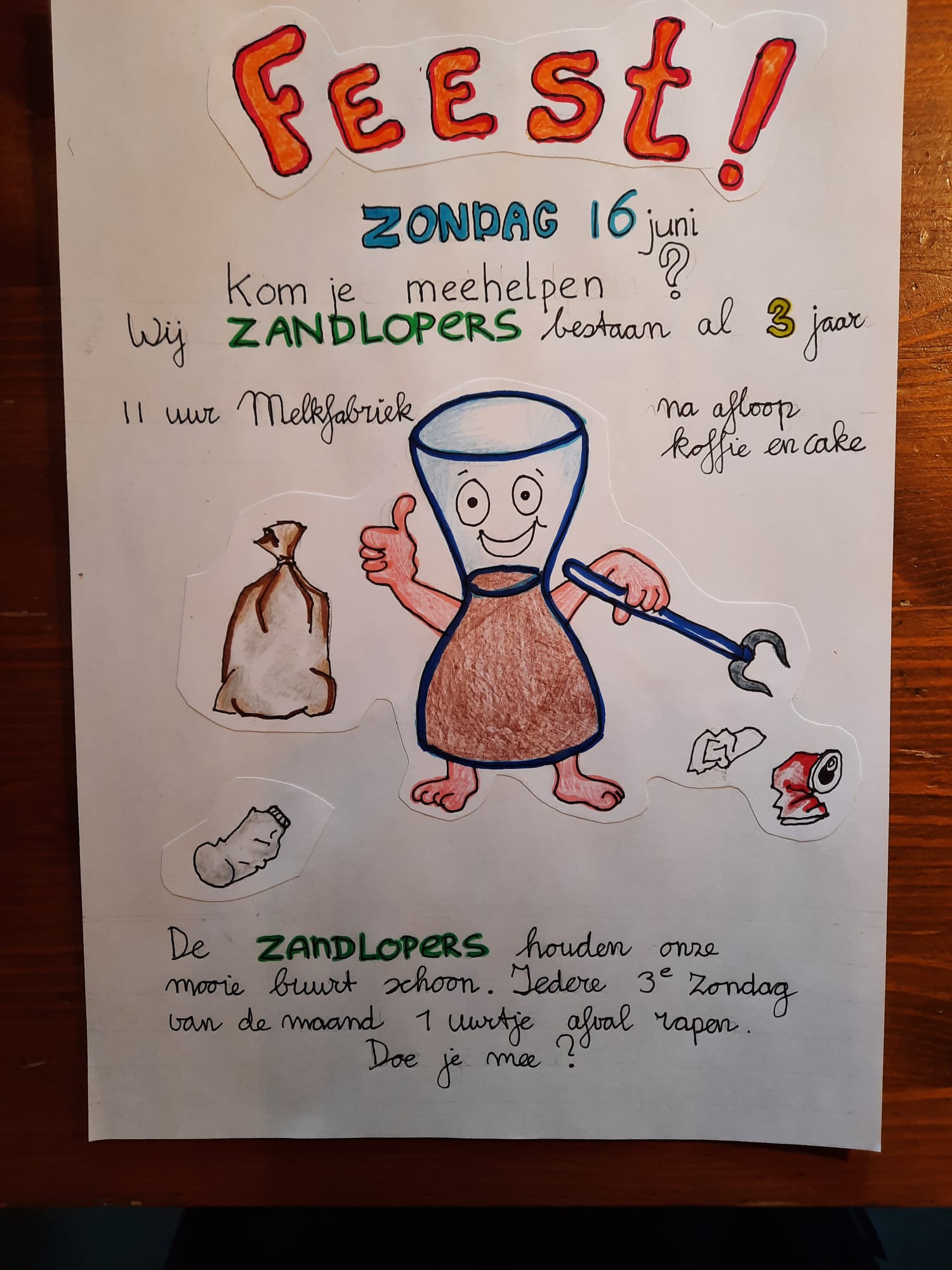 Every 2nd Saturday and every 3rd Sunday of the month, the Zandlopers gather. We then pick up litter from the streets of our beautiful neighbourhood for one hour. In June we celebrated the 3rd birthday of the Zandbewoners!