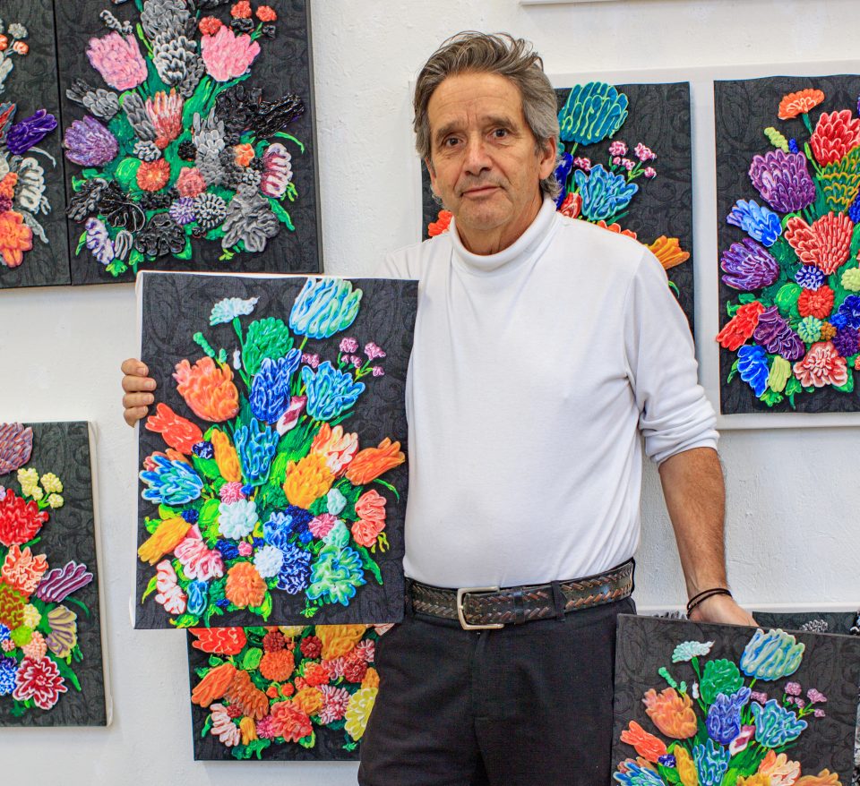 Arjan van Arendonk (1957) en werkt al sinds 1988 in de Willem II Fabriek in ’t Zand. Hij studeerde in 1982 af aan de Koninklijke Academie in Den Bosch. Arjan gebruikt bedrukte stoffen als ondergrond voor zijn schilderijen en dat maakt zijn kunst uniek en opvallend. Hiermee transformeert hij een alledaags product tot kunstwerk hetgeen past bij zijn visie: kunst is dichtbij. Arjan haalt zijn inspiratie voor zijn werk uit de natuur. Hij werkt voornamelijk met acrylverf, siliconen en borduurwerk in zijn kunst.