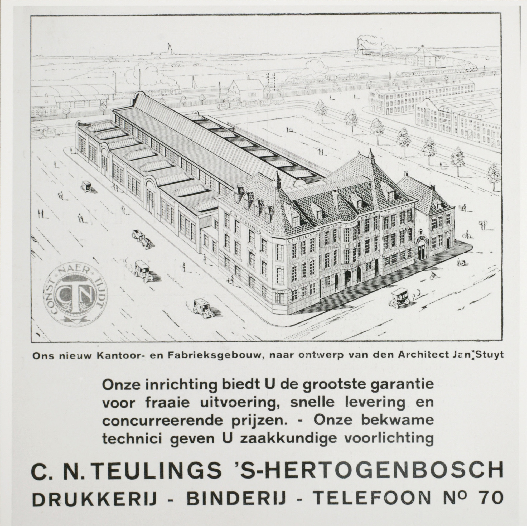 Deze foto is gemaakt in 1915 van een advertentie door een onbekende fotograaf. Op het plaatje staat het kantoor- en fabrieksgebouw van Drukkerij en Binderij Teulings.