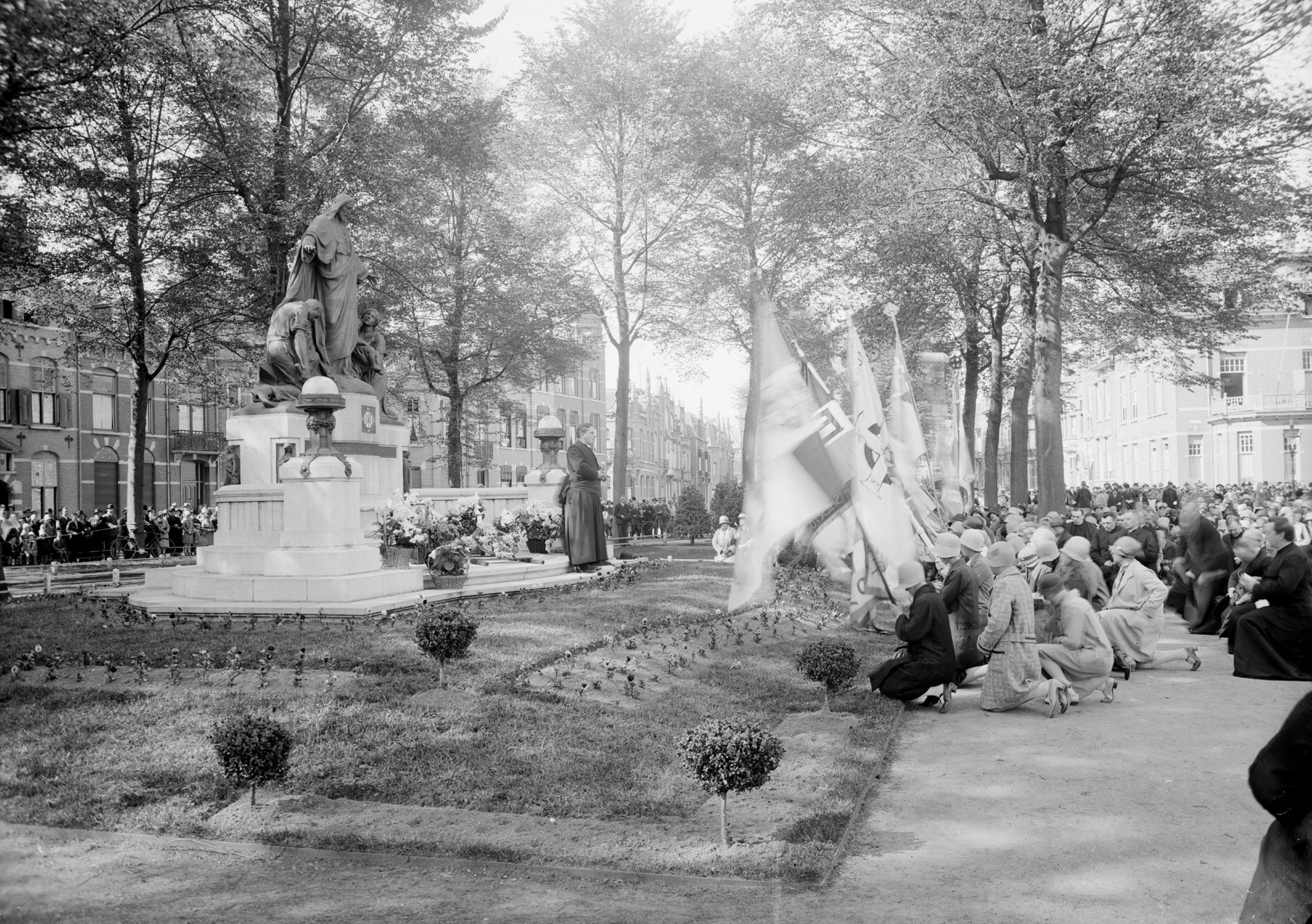 Deze foto is gemaakt op het Julianaplein op 21 mei 1929 . We zien het Heilig Hartbeeld tijdens een bijeenkomst van de katholieke jeugdbeweging met de naam Eucharistie Kruistocht.