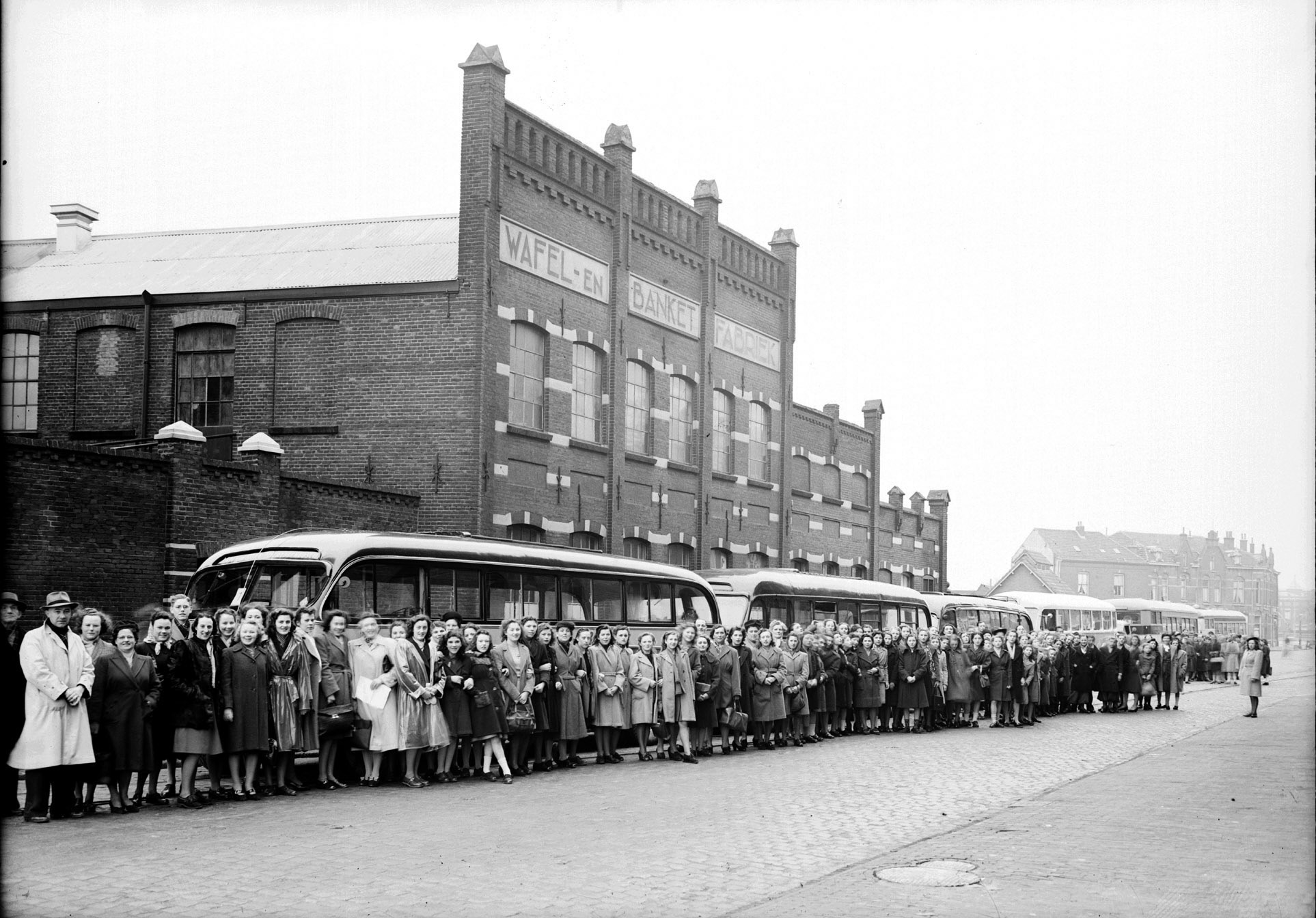 Deze foto is gemaakt op 20 maart 1948. Hier zien we de Verkadefabriek met het volledige personeel, klaar voor vertrek op een personeelsuitje naar Carré in Amsterdam. Helemaal links in de witte regenjas staat de chef van het bedrijf naast zijn vrouw (derde van links). Verder bestaat het personeel op de foto bijna geheel uit (jonge) vrouwen.