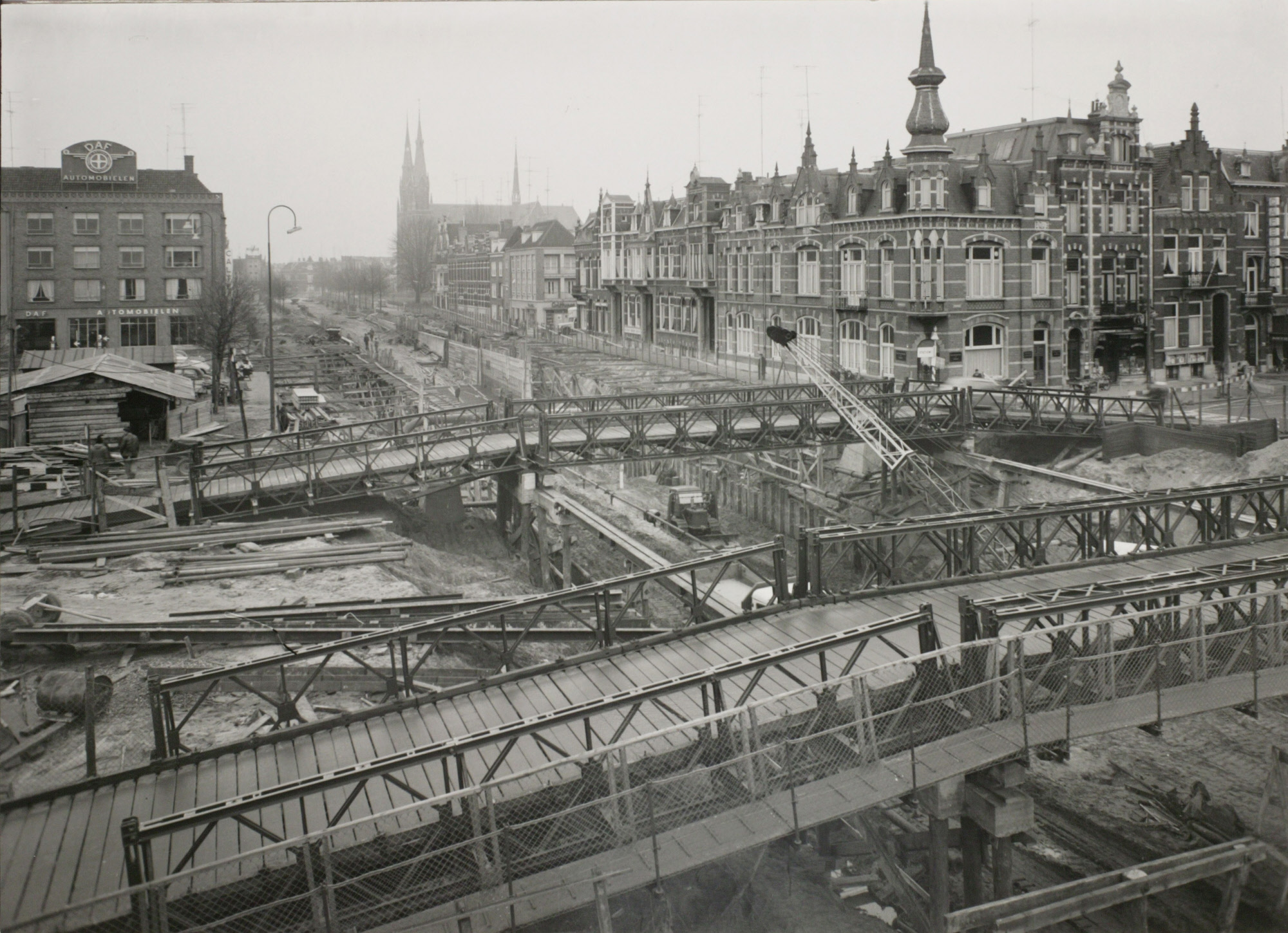 Op deze foto van 13 december 1959 zien we het Stationsplein. We zien de bouwwerkzaamheden voor de aanleg van de Stationstunnel. Er zijn tijdelijk twee grote baileybruggen van oost naar west gelegd, zodat mensen konden oversteken zonder om te hoeven lopen. Op de achtergrond zien we de twee torens van de imposante Sint-Leonarduskerk.