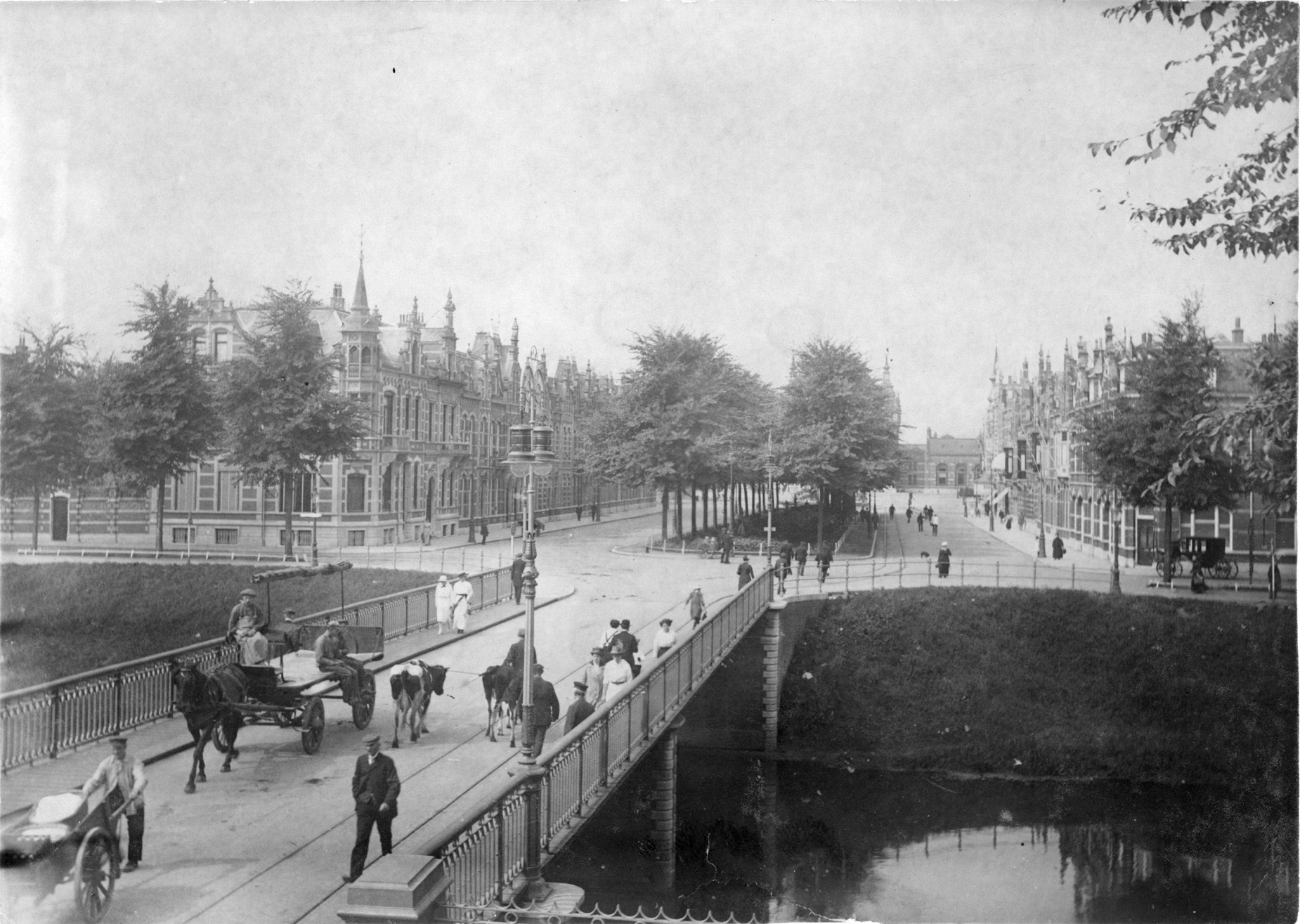 Toen deze foto werd gemaakt, werd alles nog vervoerd met hand- en paardenwagens. Auto’s waren er immers nog niet. Midden op de brug loopt een man met zijn koe. Rechts, onder de bomen op de Havensingel, zien we een koets.