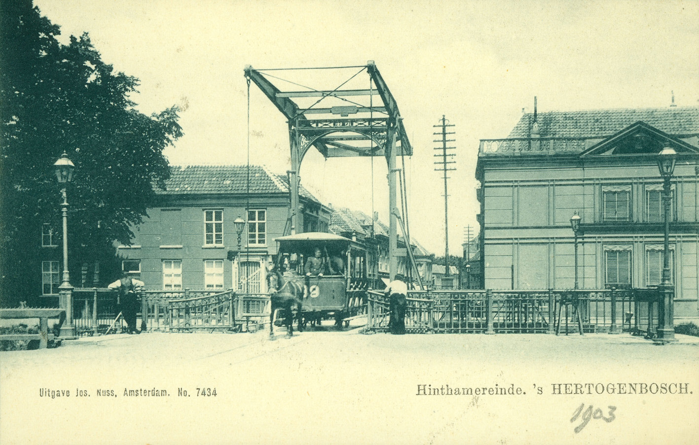 Op deze foto uit 1903 staat de Hinthamerbrug. Hier zien we paardentram nr. 39 die vertrok vanaf het Hinthamereinde. Deze tram reed via de Markt en de Stationsbrug naar het Centraal Station en weer terug.