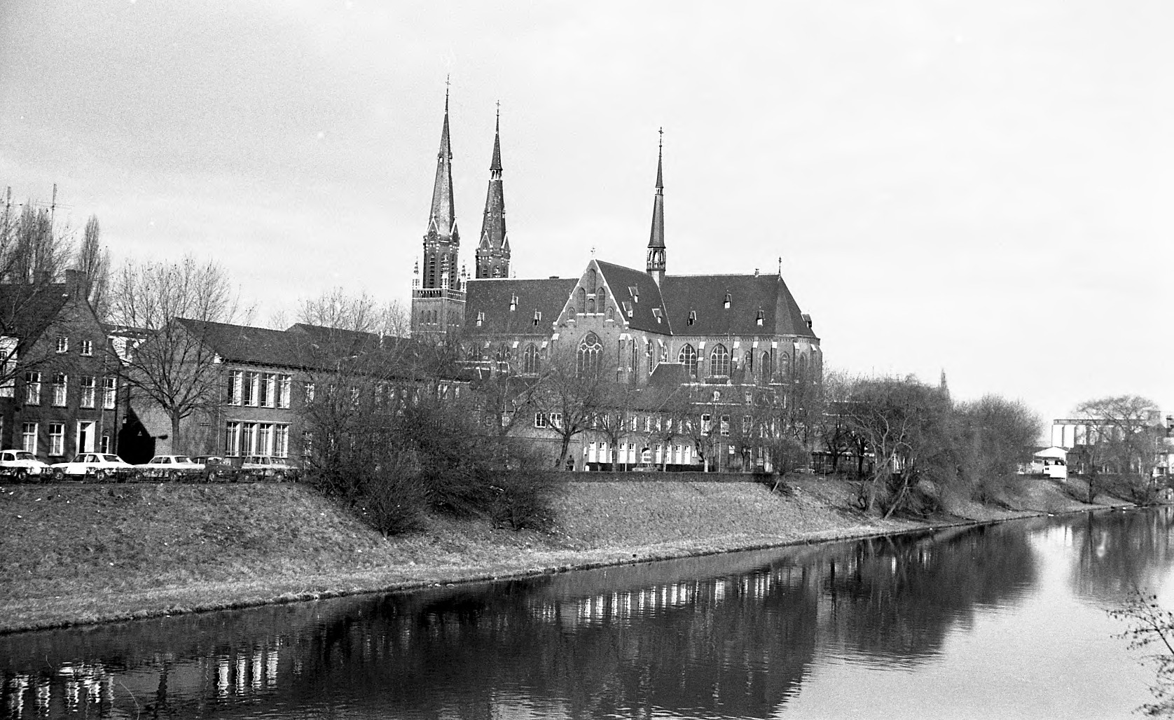 Deze foto is in 1925 gemaakt vanaf de Buitenhaven aan de overkant van de Dommel. We zien de torenspitsen van de Sint Leonarduskerk en rechts op de achtergrond de silo’s van de Koudijs mengvoederfabriek.