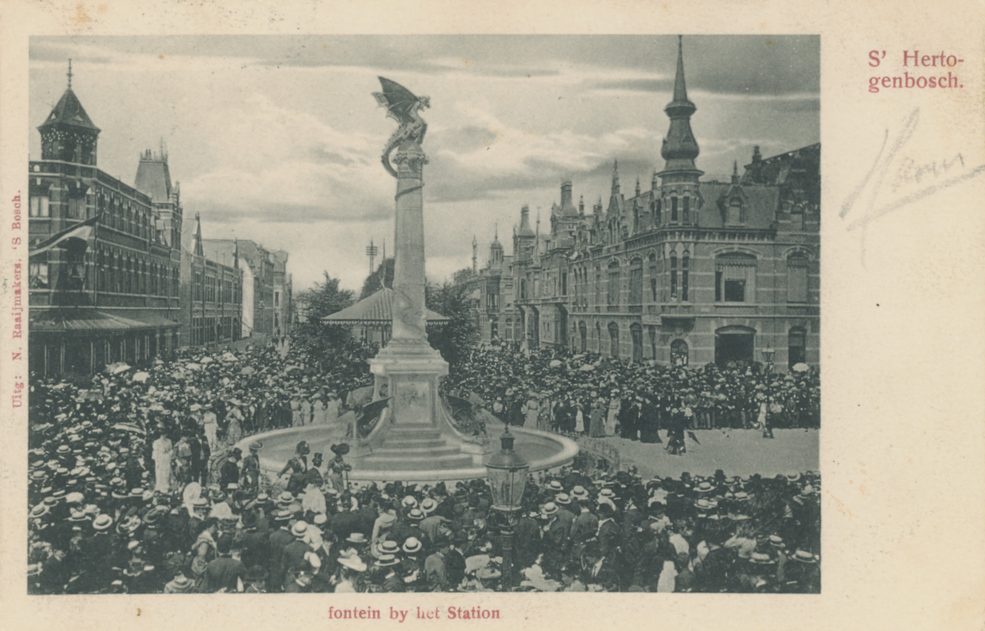 De Drakenfontein is officieel in gebruik genomen op 19 juli 1903. Dat is dit jaar precies 120 jaar geleden! Van de openingsfoto zijn ansichtkaarten gemaakt en die zijn ingescand door Erfgoed ‘s-Hertogenbosch, zoals te zien is op het plaatje.